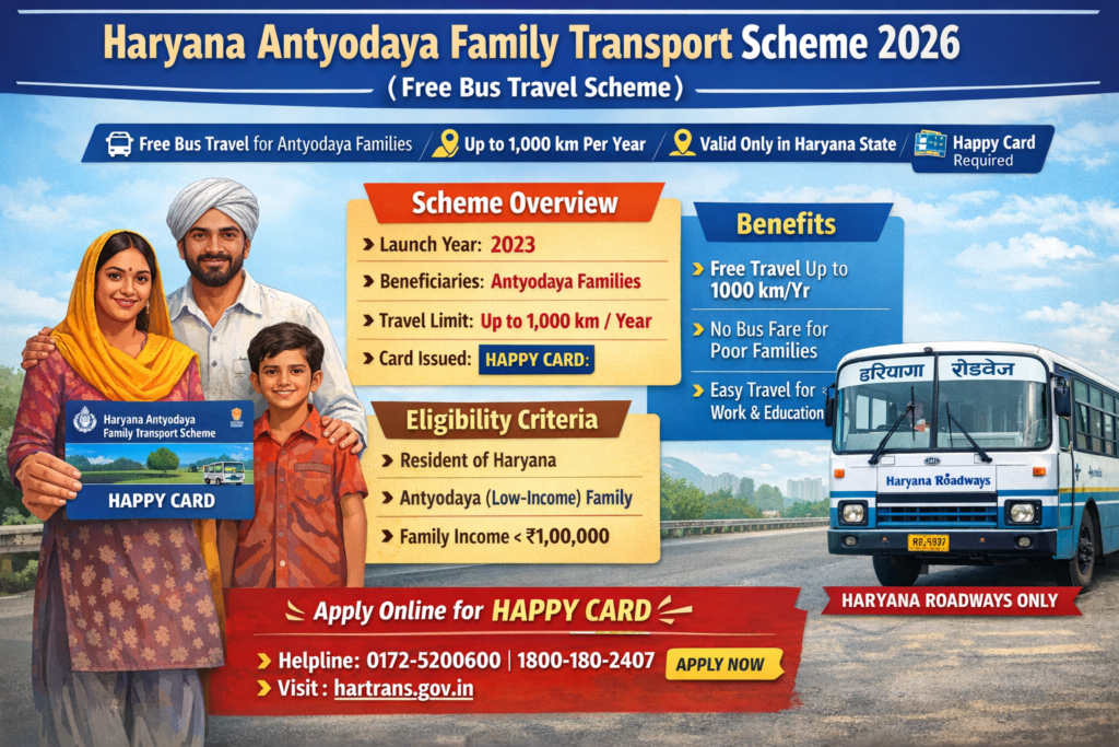 The Haryana Antyodaya Family Transport Scheme is a welfare initiative launched by the Haryana Government to support economically weaker families by reducing their travel expenses. Under this scheme, eligible Antyodaya families can travel free of cost in Haryana Roadways buses for up to 1,000 kilometers annually. The benefit is provided through a “Happy Card,” issued after successful online application and verification. The scheme is applicable only within Haryana and aims to improve accessibility for work, education, and daily needs. It primarily targets families with an annual income below ₹1 lakh, ensuring financial relief and better mobility across the state.