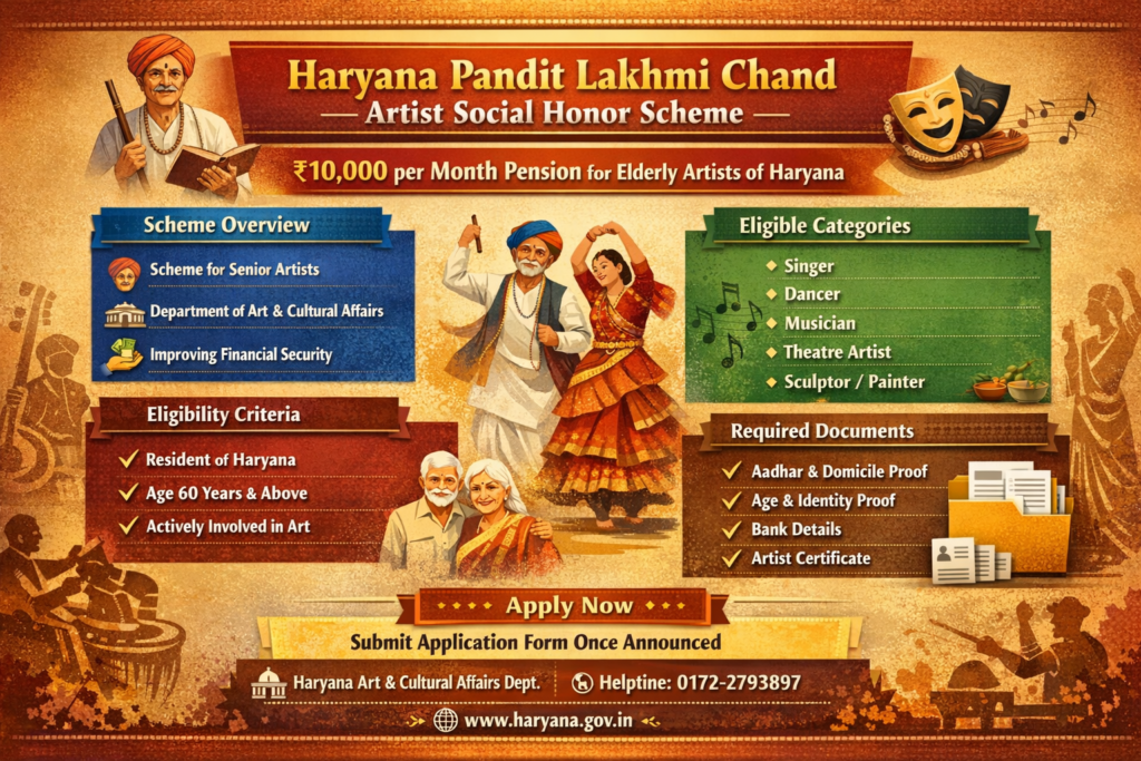 The Haryana Pandit Lakhmi Chand Artist Social Honor Scheme is a welfare initiative launched by the Government of Haryana to provide financial support to elderly artists. This scheme aims to help artists who have dedicated their lives to cultural fields but face financial difficulties in old age. Under this program, eligible beneficiaries will receive a monthly pension of ₹10,000 to ensure a stable livelihood. It is managed by the Department of Art and Cultural Affairs, Haryana. The scheme recognizes the contribution of artists such as singers, musicians, dancers, painters, and sculptors, and seeks to improve their dignity and economic security.