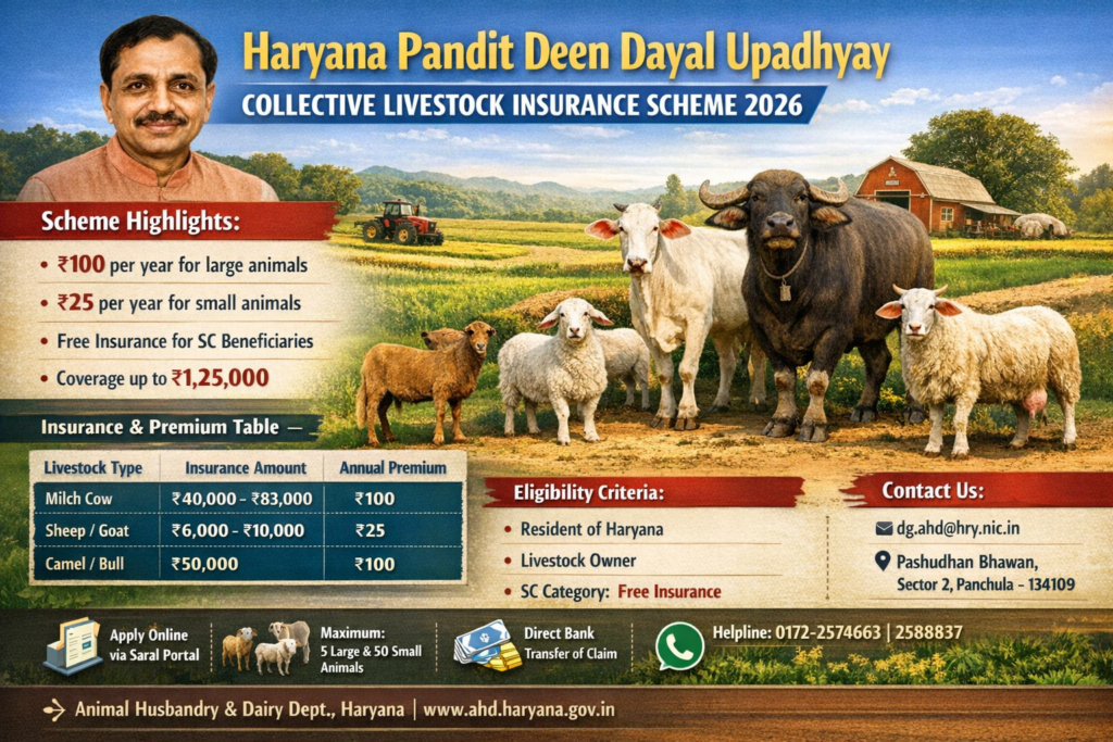 The Haryana Pandit Deen Dayal Upadhyay Collective Livestock Insurance Scheme is a welfare initiative launched by the Government of Haryana to provide financial protection to livestock owners. Started in 2019, this scheme ensures that farmers and animal rearers can insure their livestock at highly subsidized rates. With minimal premium charges, beneficiaries can safeguard their animals against loss due to death or theft. The scheme is managed by the Animal Husbandry and Dairy Department of Haryana and aims to strengthen rural livelihoods, reduce financial risks, and promote sustainable animal farming across the state.