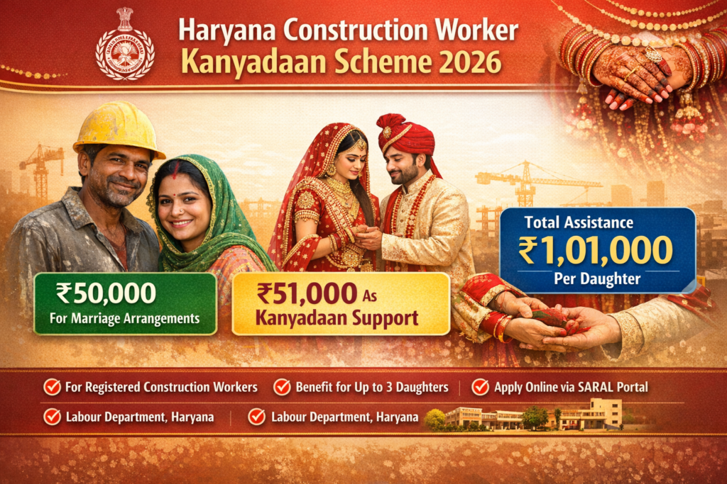The Haryana Construction Worker Kanyadaan Scheme is a welfare initiative launched by the Government of Haryana to provide financial assistance to registered construction workers for the marriage of their daughters. This scheme is managed by the Labour Department through the Building and Other Construction Workers Welfare Board. Eligible beneficiaries can receive monetary support to reduce the financial burden of marriage expenses.