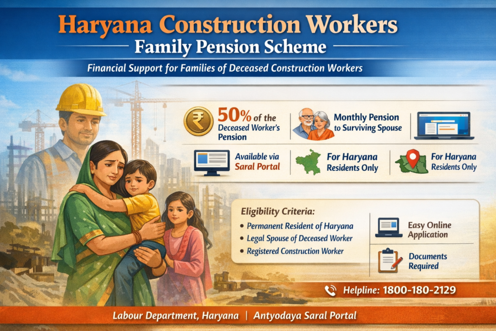 The Haryana Construction Workers Family Pension Scheme is a welfare initiative launched by the Government of Haryana to provide financial support to the family members of registered construction workers after their death.
