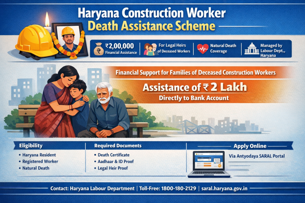 The Haryana Construction Worker Death Assistance Scheme is a welfare initiative launched by the Haryana Government to provide financial support to families of deceased construction workers. Under this scheme, a one-time assistance of ₹2,00,000 is given to the legal heir if the worker dies due to natural causes. It is managed by the Labour Department and implemented through the Haryana Building and Other Construction Workers Welfare Board. Only registered construction workers are covered under this scheme. The application process is online through the Antyodaya SARAL portal, ensuring transparency and easy access for beneficiaries across the state.