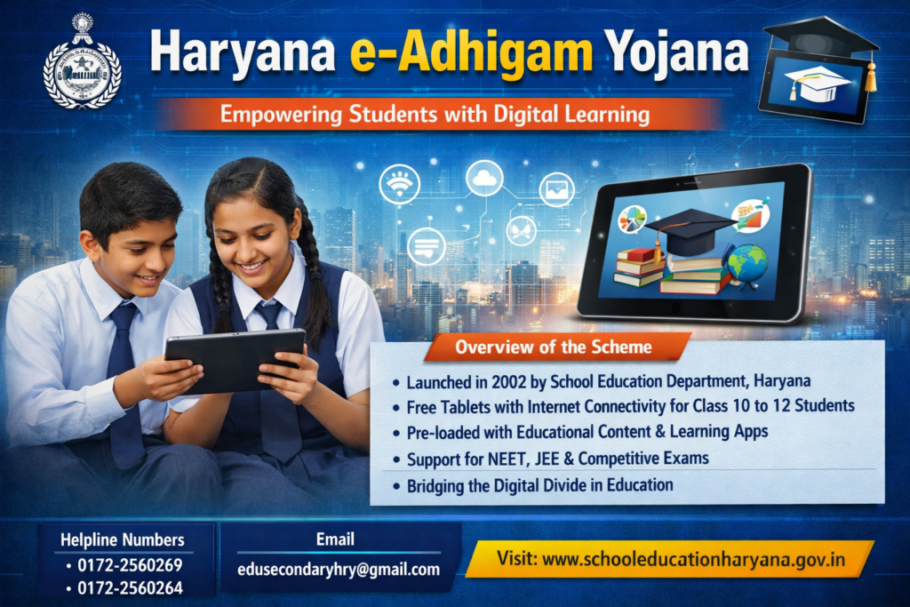 The Haryana e-Adhigam Yojana is a digital education initiative introduced by the School Education Department Haryana to strengthen learning among government school students. Launched in 2022, the scheme focuses on providing free tablets along with internet connectivity to students of Classes 10 to 12. These devices are equipped with educational content, helping students access study material anytime and improve their academic performance. The program also supports preparation for competitive exams like NEET and JEE. By promoting e-learning, the scheme aims to reduce the digital divide and create equal learning opportunities for students across Haryana.
