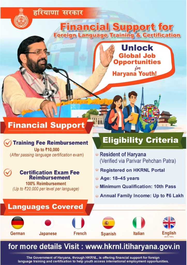 The Government of Haryana has introduced the Foreign Language Training Scheme 2026 under HKRNL. This initiative is designed to provide financial assistance to eligible youth for learning foreign languages and obtaining certifications. The scheme aims to enhance employability and open doors to global career opportunities.