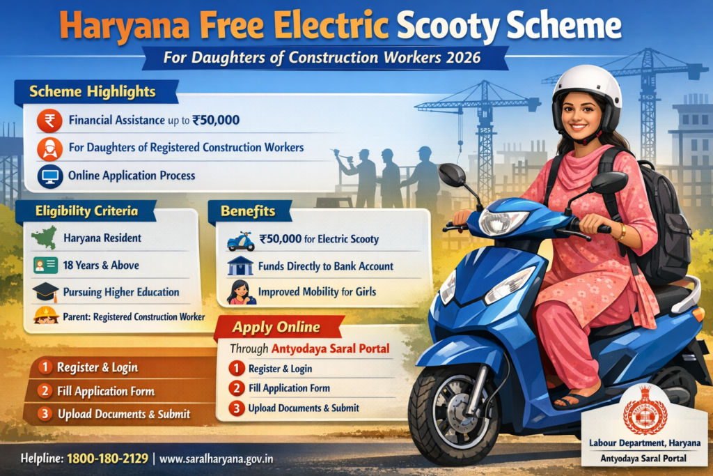 The Government of Haryana has introduced a special welfare initiative for daughters of registered construction workers. Under this scheme, eligible female students will receive financial support to purchase an electric scooty, helping them commute easily for higher education.
