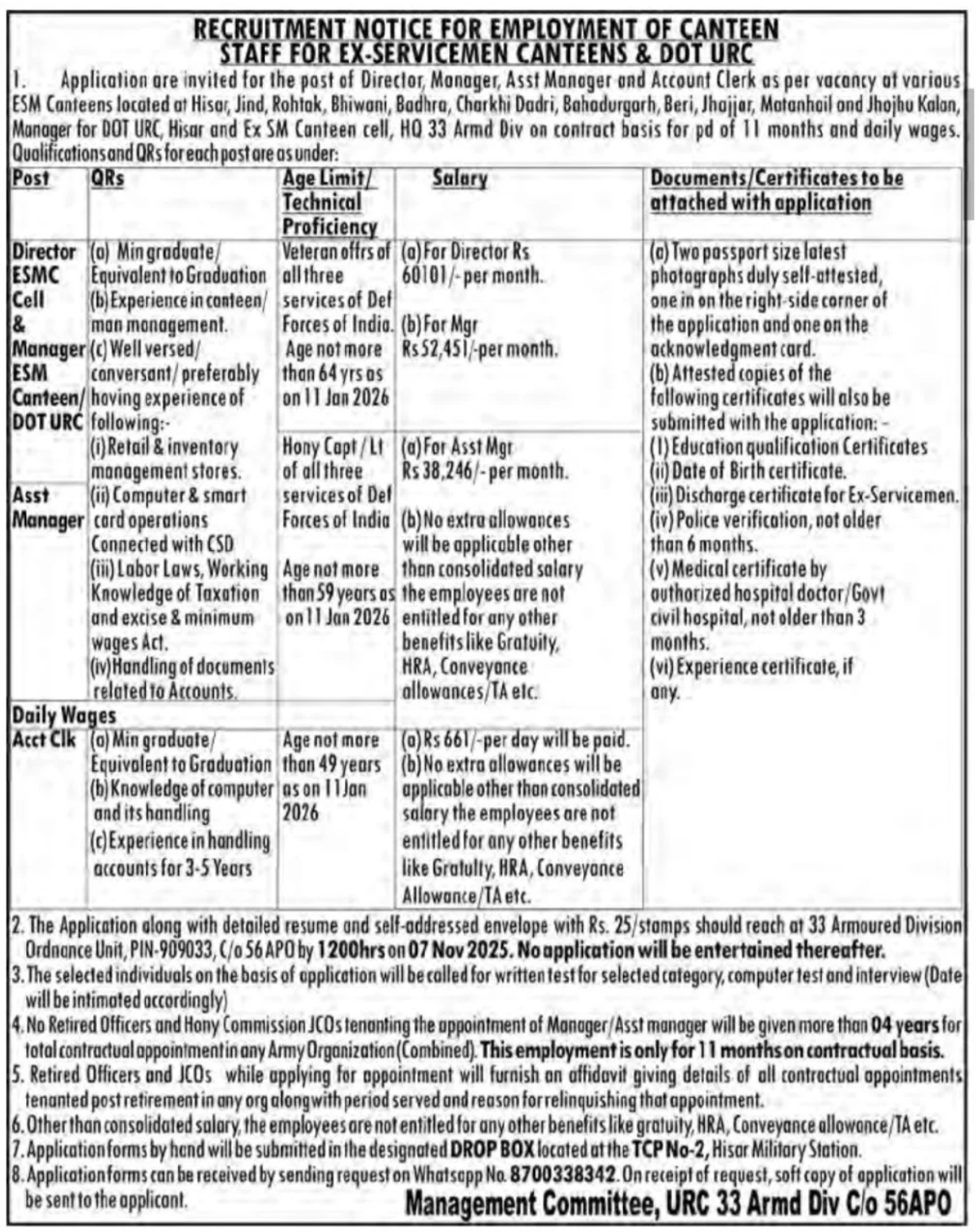 33 Armoured Division Ordnance Unit, PIN-909033, C/o 56 APO by 12:00 hrs on 07 November 2025.Alternatively, applications may be submitted by hand in the Drop Box located at TCP No-2, Hisar Military Station.