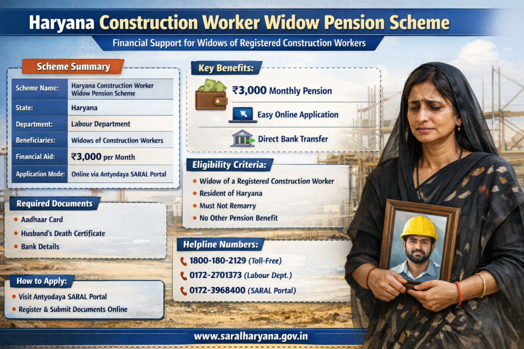 The Haryana Construction Worker Widow Pension Scheme is a welfare initiative introduced by the Government of Haryana to provide financial support to widows of registered construction workers. This scheme ensures that women who lose their husbands due to the high-risk nature of construction work can maintain a stable livelihood.