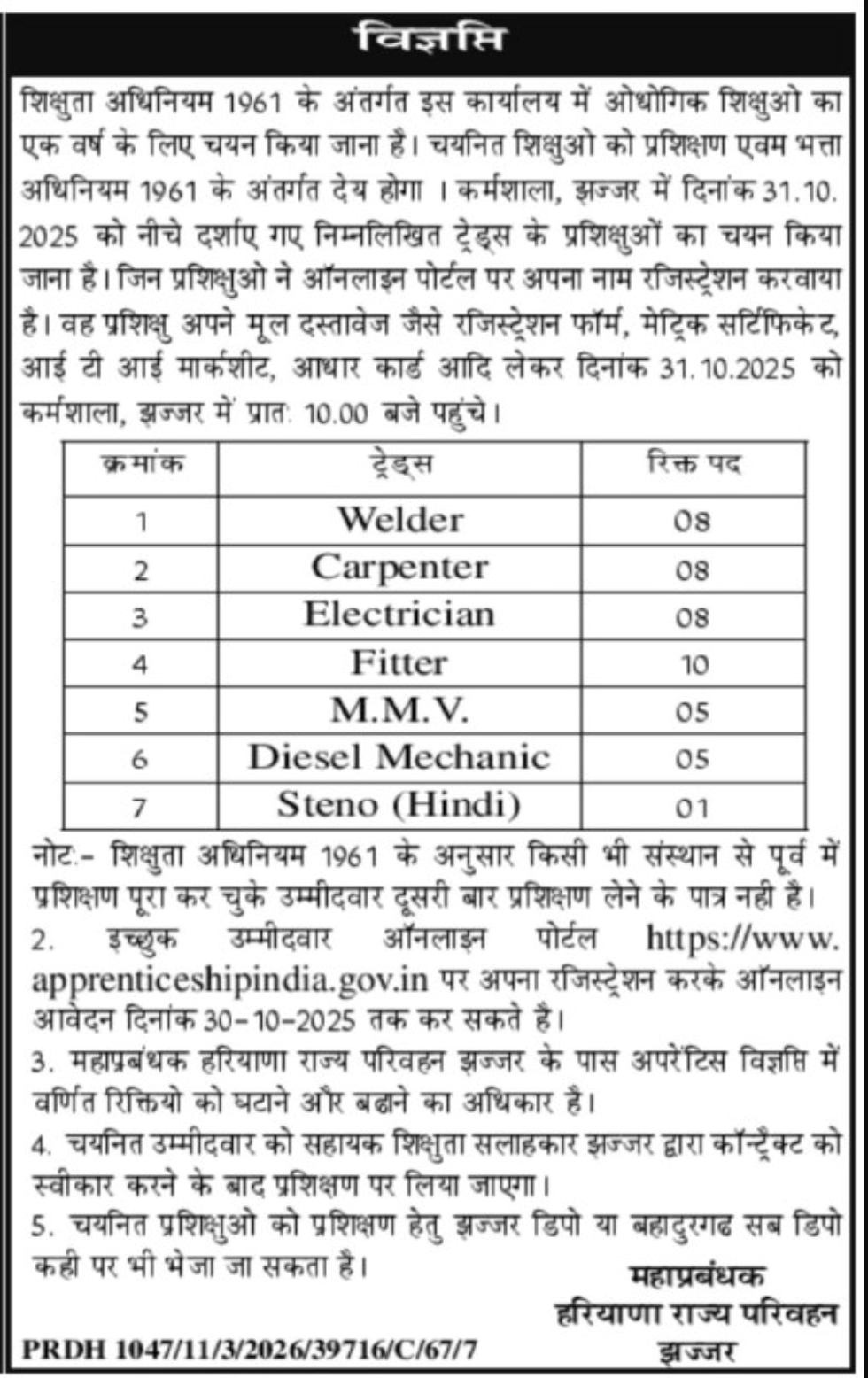 Candidates are advised to verify all details on the official website for Haryana Roadways Jhajjar Apprentice Recruitment 2025.