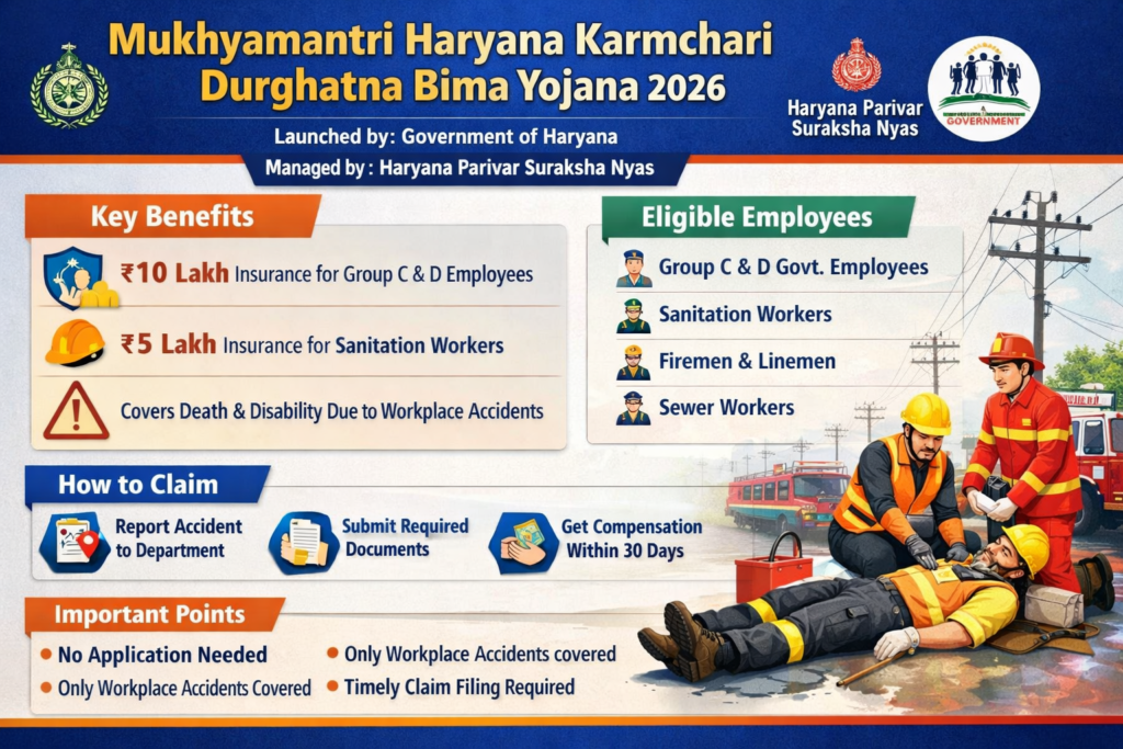 The Mukhyamantri Haryana Karmchari Durghatna Bima Yojana is a welfare scheme introduced by the Government of Haryana to provide financial security to government employees in case of accidental death or disability during duty. Managed by the Finance Department under Haryana Parivar Suraksha Nyas, the scheme covers Group C and D employees as well as sanitation workers. It offers compensation up to ₹10 lakh for eligible employees and ₹5 lakh for sanitation staff. The scheme requires no application, as eligible workers are automatically covered. Its main aim is to support employees and their families facing unexpected workplace risks and ensure timely financial assistance.