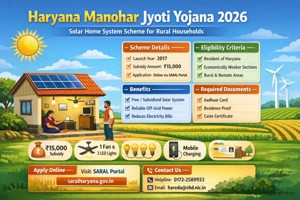 Haryana Manohar Jyoti Yojana is a welfare scheme introduced by the Government of Haryana to promote the use of solar energy in rural and electricity-deficient areas. Under this scheme, eligible households are provided with solar home systems at subsidized rates, making clean energy accessible and affordable. The initiative mainly targets economically weaker sections and families living in remote locations where regular electricity supply is limited. With the help of this scheme, beneficiaries can operate basic electrical appliances using solar power. It also supports environmental sustainability by reducing dependence on conventional energy sources and encouraging the adoption of renewable and eco-friendly power solutions.