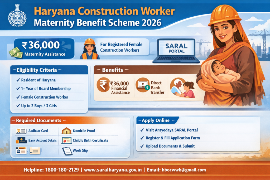 The Haryana Construction Worker Maternity Benefit Scheme is a welfare initiative launched by the Government of Haryana to provide financial assistance to registered female construction workers after childbirth. The scheme is managed by the Labour Department through the Haryana Building and Other Construction Workers Welfare Board.