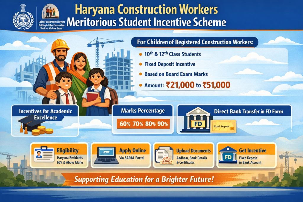 The Haryana Construction Workers Meritorious Student Incentive Scheme is a valuable initiative that supports the education of workers’ children. By rewarding academic performance, the scheme not only motivates students but also strengthens the future of families associated with the construction sector.