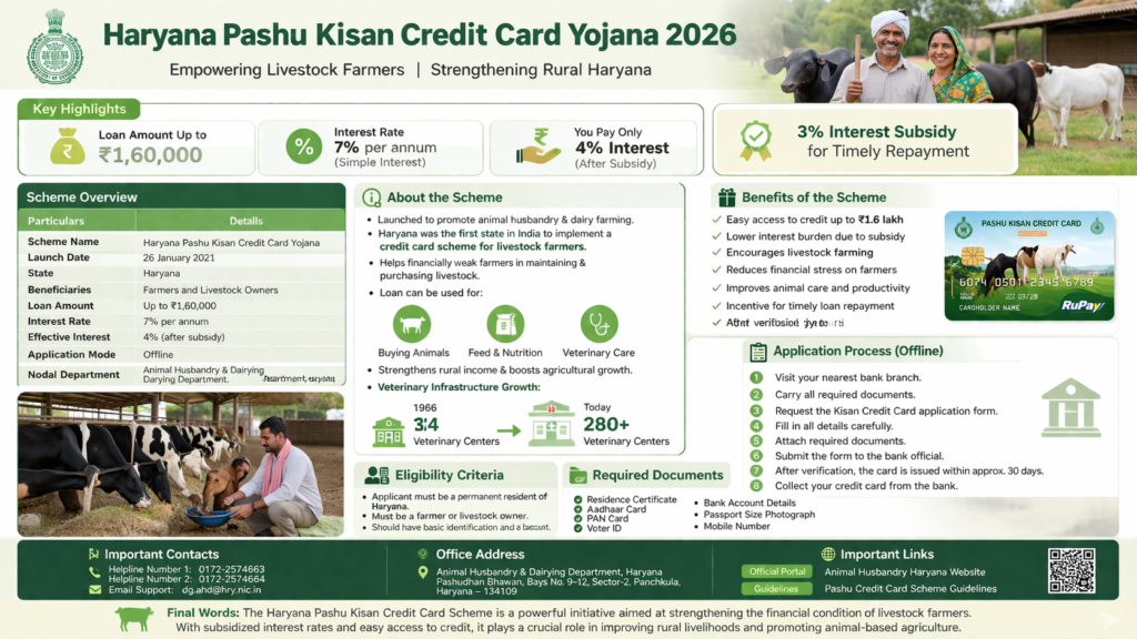 The Haryana Pashu Kisan Credit Card Scheme is a powerful initiative aimed at strengthening the financial condition of livestock farmers. With subsidized interest rates and easy access to credit, it plays a crucial role in improving rural livelihoods and promoting animal-based agriculture.