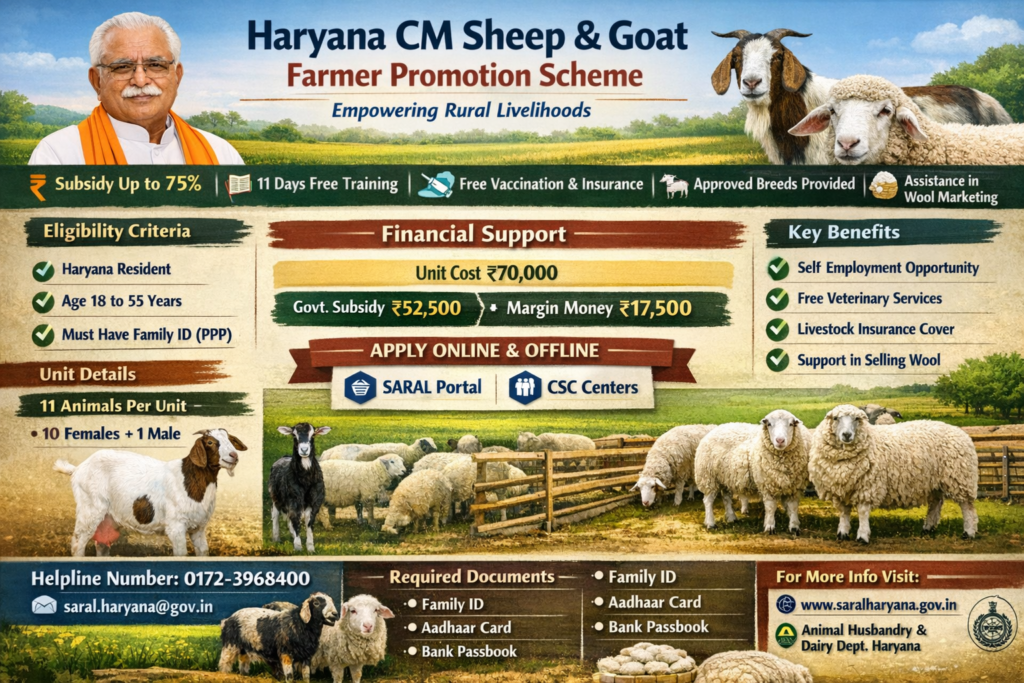 The Haryana Chief Minister Sheep and Goat Farmer Promotion Scheme is a government initiative aimed at boosting livestock farming and creating self-employment opportunities in rural areas. Under this scheme, eligible individuals can establish a sheep or goat farming unit with financial support through backend subsidies. Beneficiaries also receive 11 days of professional training along with free veterinary care, vaccination, and insurance for their animals. The scheme focuses on improving income levels of unemployed and economically weaker sections while promoting high-quality livestock breeding. It plays a vital role in strengthening the rural economy and encouraging sustainable animal husbandry practices across Haryana.
