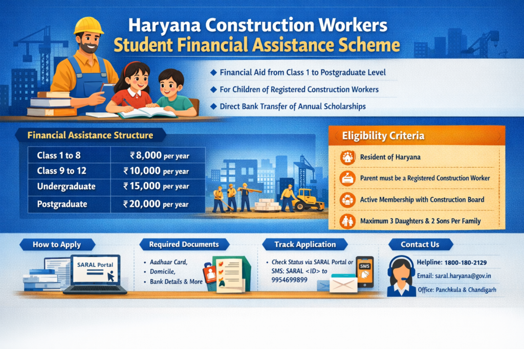 The Haryana Construction Workers Student Financial Assistance Scheme is an initiative by the Government of Haryana to support the education of children belonging to registered construction worker families. Under this scheme, financial aid is provided annually from primary classes up to postgraduate studies, helping reduce the burden of educational expenses. The scheme is implemented by the Haryana Building and Other Construction Workers Welfare Board through the Antyodaya SARAL Portal. Eligible students receive direct financial benefits in their bank accounts. It aims to promote continuous education, improve literacy levels, and ensure better academic opportunities for economically weaker sections across the state.