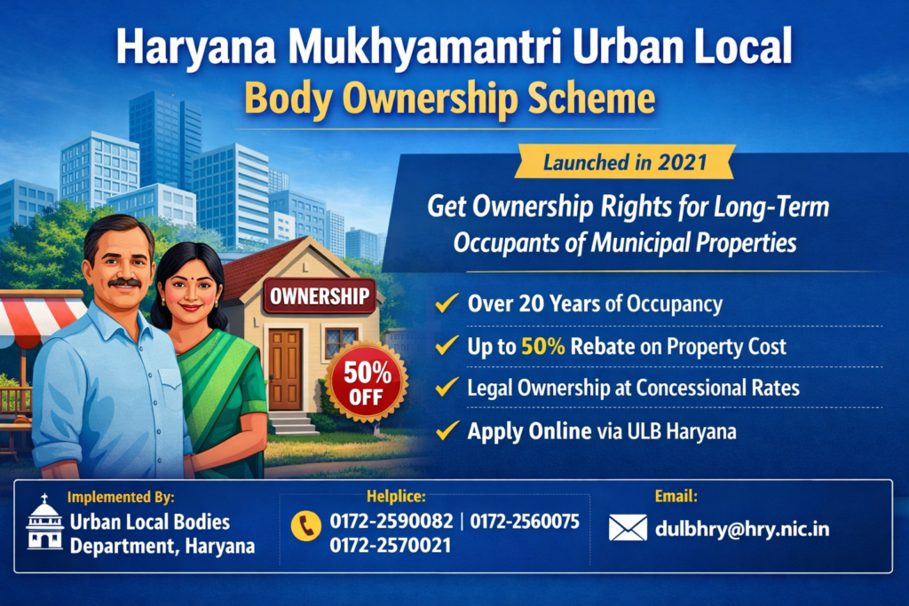 The Haryana Mukhyamantri Urban Local Body Ownership Scheme is a government initiative launched in 2021 to provide ownership rights to individuals who have been occupying municipal properties for a long time. This scheme mainly benefits those living or running businesses in shops or houses on rent, lease, or license basis for over 20 years. Eligible applicants can obtain legal ownership at concessional rates, including up to 50% rebate on the property cost. Implemented by the Urban Local Bodies Department, Haryana, the scheme aims to ensure property security, reduce disputes, and promote transparency in urban land management while empowering long-term occupants with rightful ownership.